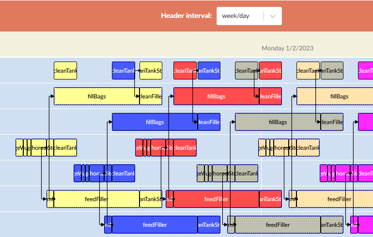 - Drag-and-drop functionality for moving tasks vertically (shift tasks in time) or horizontally (change the task order or resource assignment).